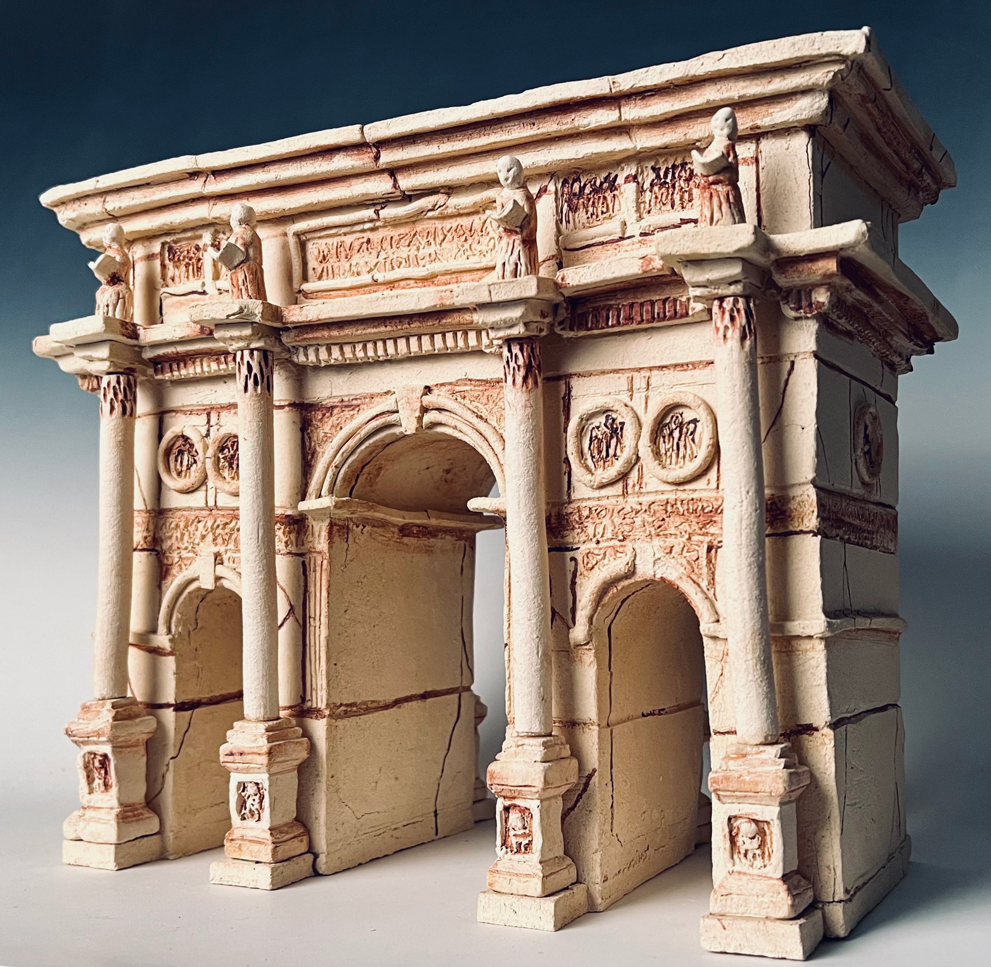 A interpretive replica of the Arch of Constantine, AD 315, Rome. Created in Cone 5 fired stoneware. 12H x 4W x 14L