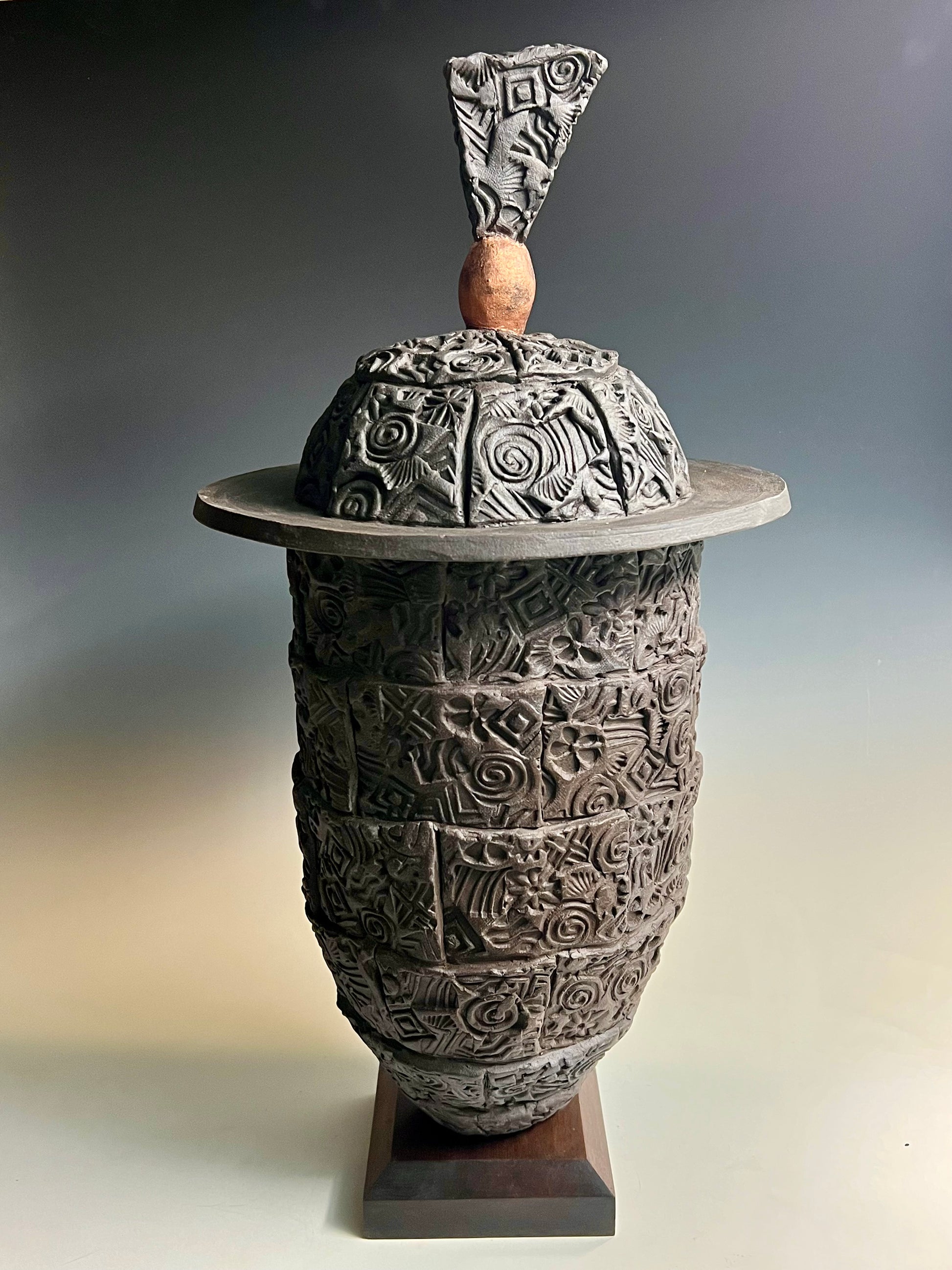 | Textured high fired Black Mountain stoneware w/ removable top & mounted on walnut base |
